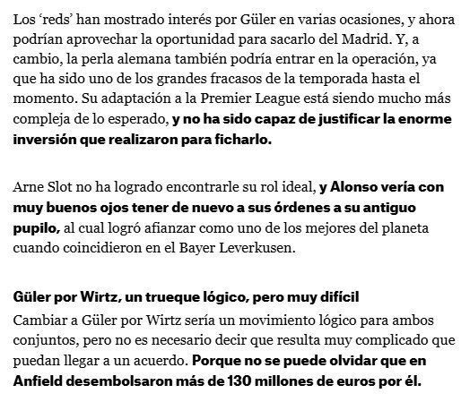 Wirtz’in Liverpool kariyerine beklenildiği başlamamasına ve Arda Güler’e ilgi duymasına rağmen 130 milyon euro’nun üzerinde bir bedel ödemiş olmasının, bu takası oldukça zor kıldığı da belirtildi. İngiliz kulübünün, Wirtz’i gözden çıkarmaya niyetli olmadığı ve takasın gerçekleşmesi halinde Real Madrid’den ekstra bir ücret talep edeceği vurgulandı.