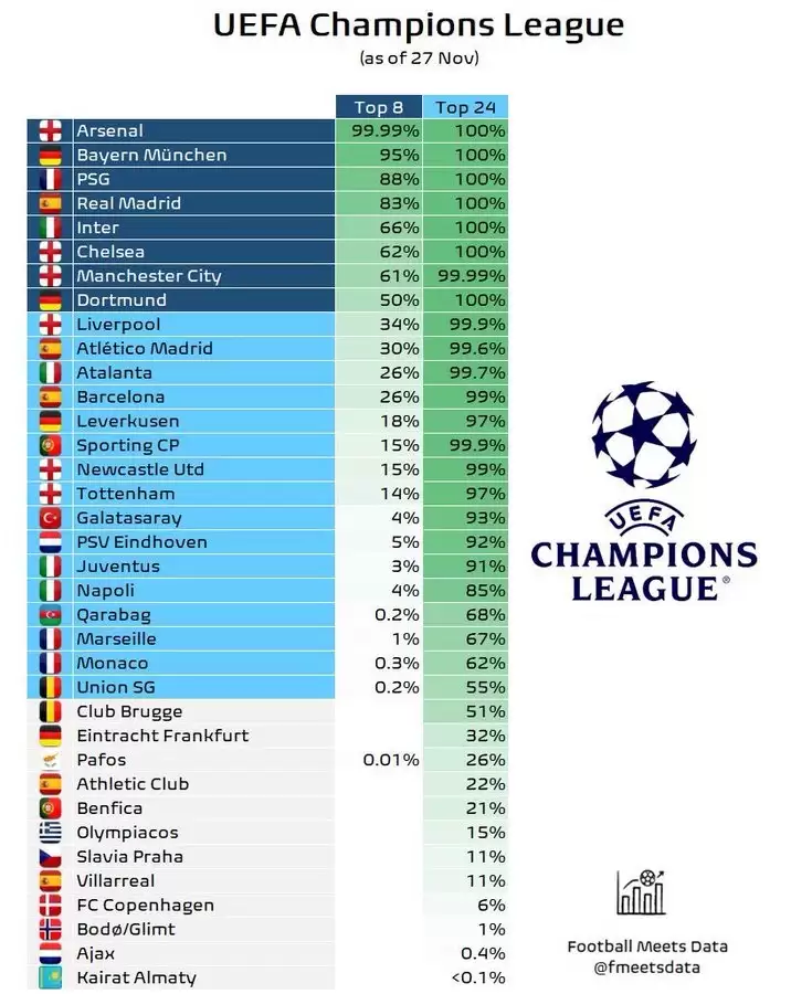 UEFA kulüp şampiyonalarında lig aşaması heyecanı devam ediyor. Lig aşamasının sonuna yaklaşılırken Football Meets Data tarafından kulüplerin ilk 8 ve ilk 24 olasılıkları yüzdesel olarak hesaplandı. İşte temsilcilerimizin tur ihtimalleri…