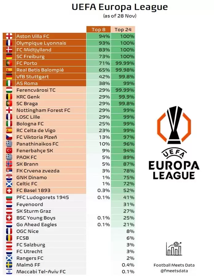 Açıklanan verilere göre UEFA Avrupa Ligi’nde Fenerbahçe’nin tur kapısını aralama ihtimalleri çok yüksek. %9 ihtimalle ilk 8’e girebilecek sarı kanaryalarda ilk 24’te bitirme oranı %94 olarak açıklandı. Şu anki sıralamaya göre Fenerbahçe’nin play-off rakipleri Celta Vigo – Viktoria Plzen ikilisinden biri olabilir.