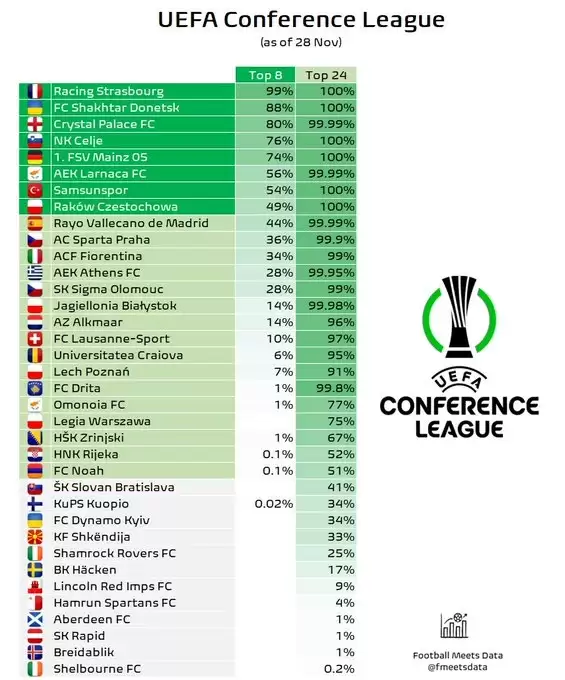 Dördüncü haftası sona eren UEFA Konferans Ligi’nde lider olan temsilcimiz Samsunspor, ilk 24’te olmayı garantilerken %54 ihtimalle ilk 8’de yer alacak.