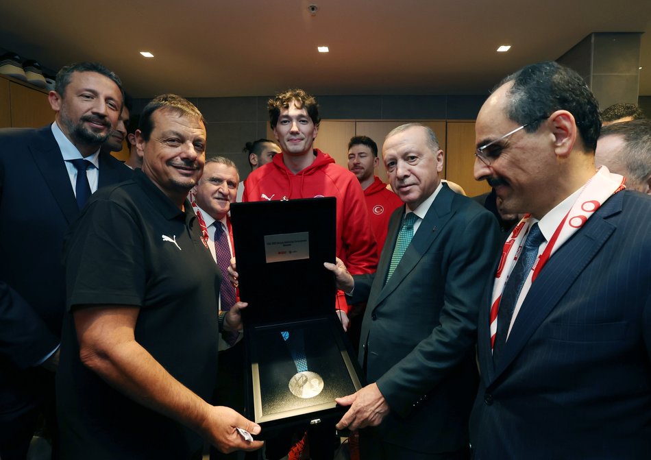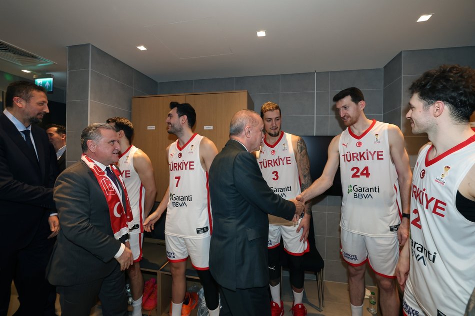 Başkan Erdoğan, A Milli Basketbol Takımı’nı Dünya Kupası yolundaki ilk sınavında yalnız bırakmayarak, 2027 FIBA Dünya Kupası Elemeleri kapsamında Bosna Hersek ile oynadığı karşılaşmayı salonda takip etti. Turkcell Basketbol Gelişim Merkezi’nde oynanan mücadeleyi Başkan Erdoğan’ın yanı sıra Gençlik ve Spor Bakanı Osman Aşkın Bak, AK Parti Genel Başkan Yardımcısı ve Parti Sözcüsü Ömer Çelik, AK Parti milletvekilleri Mehmet Muharrem Kasapoğlu, Mevlüt Çavuşoğlu ve Mustafa Varank, Cumhurbaşkanı Dış Politika ve Güvenlik Başdanışmanı Akif Çağatay Kılıç, İstanbul Valisi Davut Gül ile Türkiye Basketbol Federasyonu Başkanı Hidayet Türkoğlu ve yönetim kurulu üyeleri de izledi. MAÇIN ARDINDAN SOYUNMA ODASINI ZİYARET ETTİ! Başkan Recep Tayyip Erdoğan, 12 Dev Adam’ın galibiyeti sonrası soyunma odasında teknik heyet ve oyuncuları ziyaret etti.