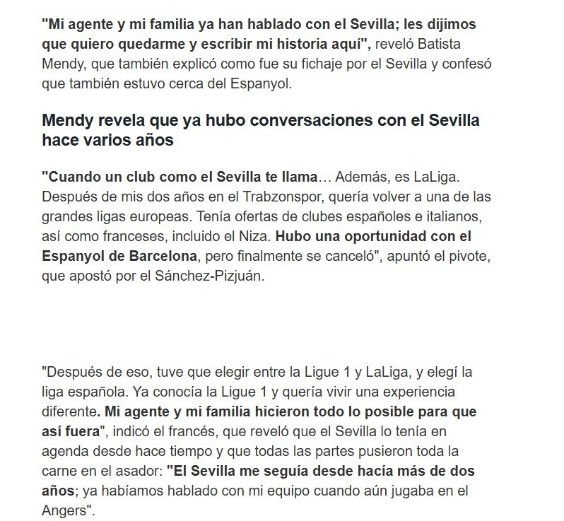 Foot Mercato’ya konuşan Mendy, “Henüz Trabzonspor ile konuşmadık ama İspanya’da mutluyum. Sezon sonunda neler olacağını göreceğiz, 7 milyon euro’luk bir satın alma opsiyonu söz konusu. Menajerim ve ailem Sevilla ile zaten görüştü; onlara burada kalmak ve kendi hikayemi yazmak istediğimi söyledik.” ifadelerini kullandı.