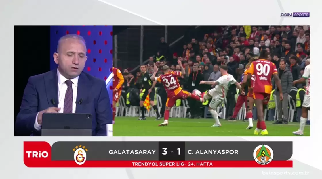 Trendyol Süper Lig’in 24. haftasında Galatasaray, sahasında Alanyaspor’u 3-1 mağlup etti. beIN TRİO programında yer alan eski hakemler Bülent Yıldırım, Deniz Çoban ve Bahattin Duran, karşılaşmadaki önemli pozisyonları ve hakem kararlarını değerlendirdi.