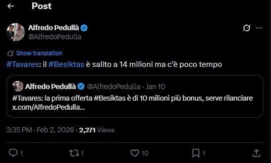 Alfredo Pedulla’nın haberine göre, oyuncu için daha önce bonuslarla birlikte 10 milyon euro’luk bir teklif yapan Beşiktaş, Tavares için yaptığı teklifi 14 milyon euro’ya yükseltti ve beklemeye geçti.