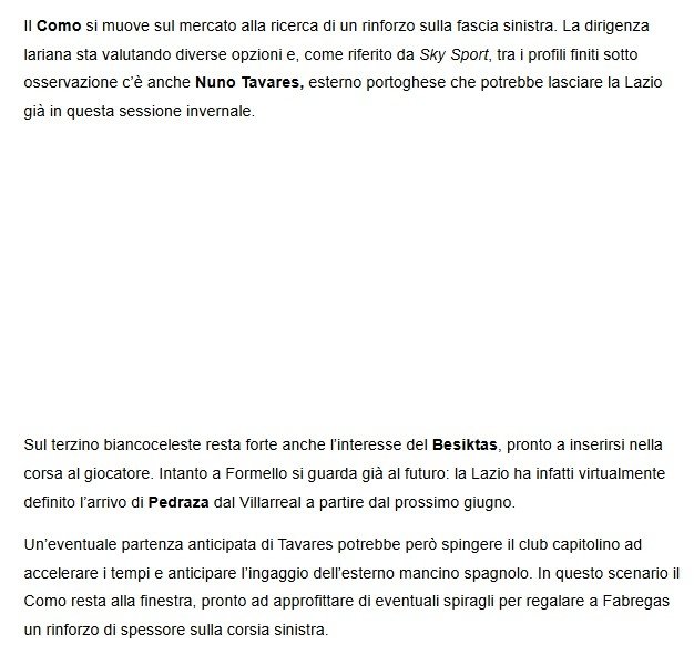 Bu sezon Avrupa kupalarına katılamaması nedeniyle elindeki yüksek bedelli oyuncuları kadrosundan çıkarmak ve daha ucuz maliyetli transferler yapmak isteyen Lazio, Tavares’in yerine Villarreal forması giyen Alfonso Pedraza ile anlaşmış durumda. Como’nun da yarışa girmesinin ardından, Lazio’nun oyuncu için fiyat beklentisinin yükselebileceği konuşuluyor.