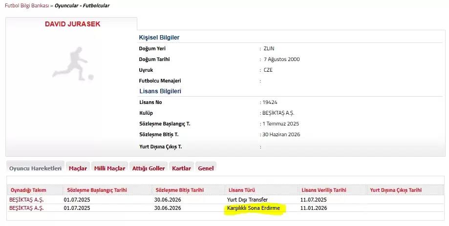 Beşiktaş, David Jurasek ile yolların ayrıldığı resmen açıkladı. Kulüpten yapılan duyuruda “2025-26 sezonu başında Futbol A Takımımıza katılan profesyonel futbolcu David Jurasek’le yollarımızı ayırmış bulunmaktayız.