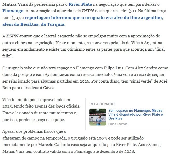 Flamengo’da Alex Sandro ile forma rekabetine girmek istemeyen ve takımdan ayrılmayı hedefleyen Vina, Beşiktaş’ın ilgisine sıcak bakmadı. ESPN’in haberine göre Uruguaylı oyuncu, Arjantin ekiplerinden River Plate’e transfer olmayı önceliklendiriyor.