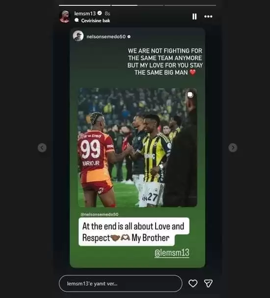 Fenerbahçe forması giyen Nelson Semedo ile Galatasaraylı Mario Lemina, derbi maçının ardından sosyal medyada dostluk mesajları paylaştı. İki eski takım arkadaşı, rekabetin dışında sevgi ve saygıyı ön plana çıkardı.