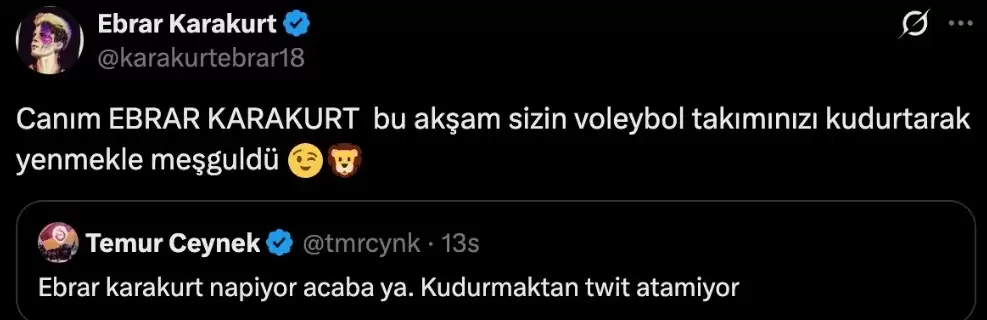Ebrar, Galatasaray taraftarının hakkındaki paylaşımını alıntılayarak, “Canım, Ebrar Karakurt bu akşam sizin voleybol takımınızı kudurtarak yenmekle meşguldü.” yanıtını verdi.