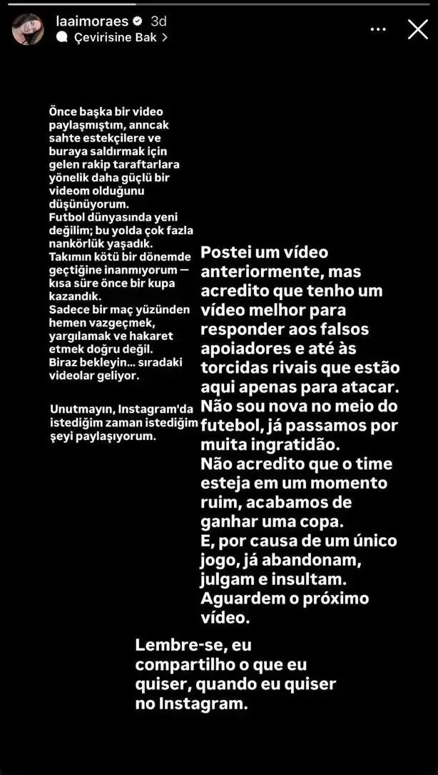 Sosyal medya hesabından tepkilere ve olumsuz yorumlara yanıt veren Lais Moraes, sarı-lacivertli taraftarları moralli olmaya çağırdı.