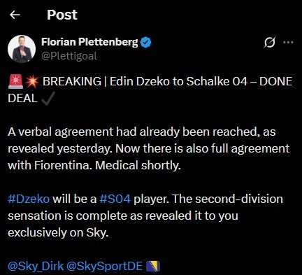 Sky’ın haberine göre Fiorentina, Edin Dzeko’nun Schalke’ye transferi için her konuda anlaşma sağladı.