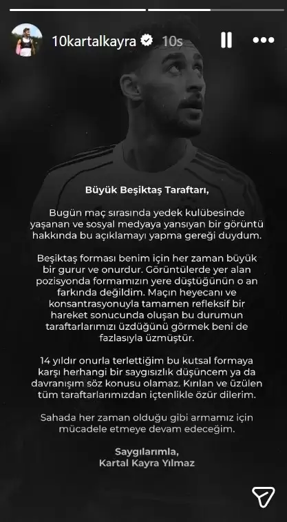 Kartal Kayra Yılmaz’ın yedek kulübesinde Beşiktaş formasını ayağıyla ittiği görüntü sosyal medyada gündem oldu. Tepkilerin ardından 25 yaşındaki futbolcu özür diledi.