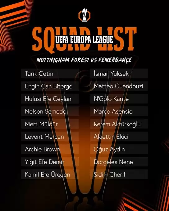 📋 Nottingham Forest maçı kamp kadromuz. #UEL #NFFCvFB pic.twitter.com/IbVhYC0nno— Fenerbahçe SK (@Fenerbahce) February 25, 2026