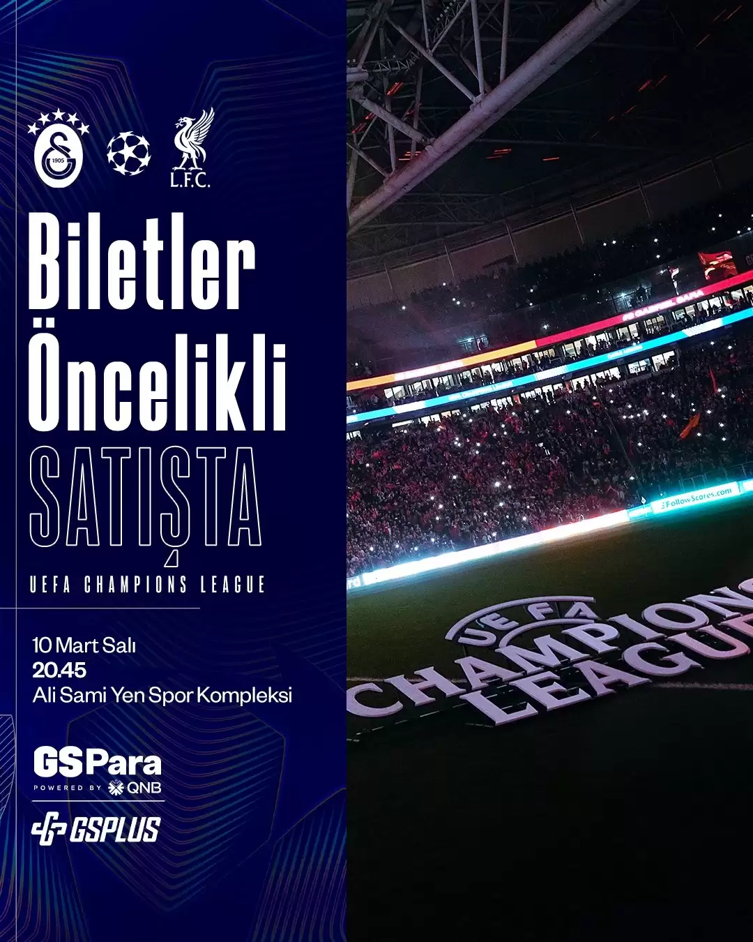 Kulüpten yapılan açıklamada, “Galatasarayımız UEFA Şampiyonlar Ligi Son 16 Turu’nun ilk ayak maçında 10 Mart 2026 Salı günü saat 20.45’te Liverpool ile Ali Sami Yen Spor Kompleksi’nde karşı karşıya gelecek. Biletler GSPlus Premium Üyeleri ile GSPara Kredi ve Banka Kartı sahiplerine öncelikli olarak satış sunuldu.