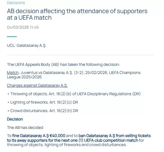 UEFA, 25 Şubat 2026’da oynanan Juventus deplasmanında yaşanan taraftar olayları nedeniyle Galatasaray’a 40 bin euro para cezası ve bir sonraki deplasman maçında seyircisiz oynama yaptırımı uygulamıştı.