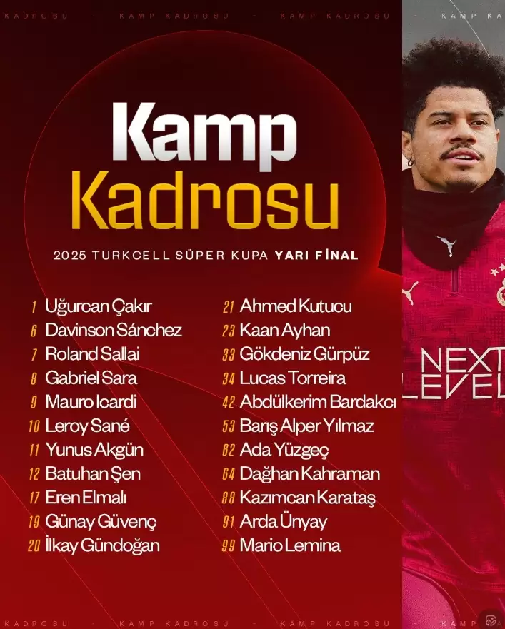 “Uğurcan Çakır, Davinson Sanchez, Roland Sallai, Gabriel Sara, Mauro Icardi, Leroy Sane, Yunus Akgün, Batuhan Şen, Eren Elmalı, Günay Güvenç, İlkay Gündoğan, Ahmed Kutucu, Kaan Ayhan, Gökdeniz Gürpüz, Lucas Torreira, Abdülkerim Bardakcı, Barış Alper Yılmaz, Ada Yüzgeç, Dağhan Kahraman, Kazımcan Karataş, Arda Ünyay, Mario Lemina.”