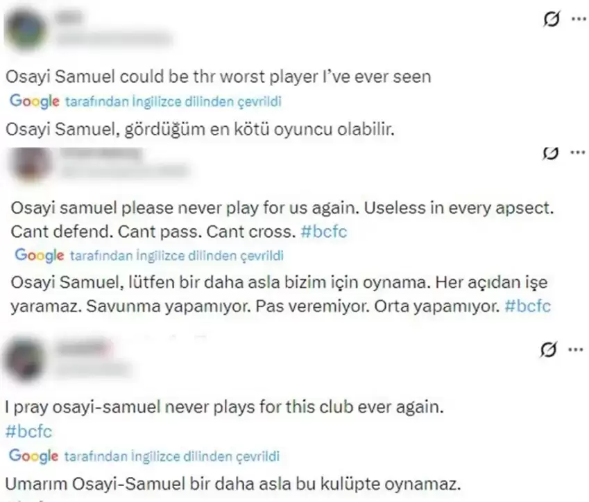 Maça ilk 11’de başlayan ve 72. dakikada teknik direktör Chris Davies tarafından kenara alınan Osayi-Samuel’in yenilen 2 golde doğrudan hatası olduğunu düşünen taraftarlar, Nijeryalı sağ bek ilgili çarpıcı paylaşımlarda bulundu.