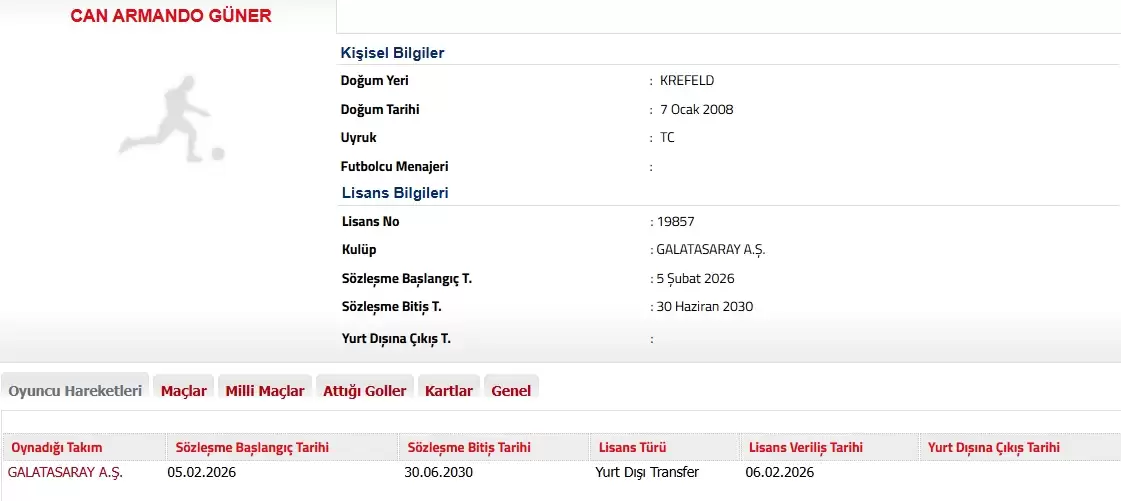 Galatasaray, Can Armando Güner ile 4.5 yıllık sözleşme imzalandığını TFF’ye bildirdi.