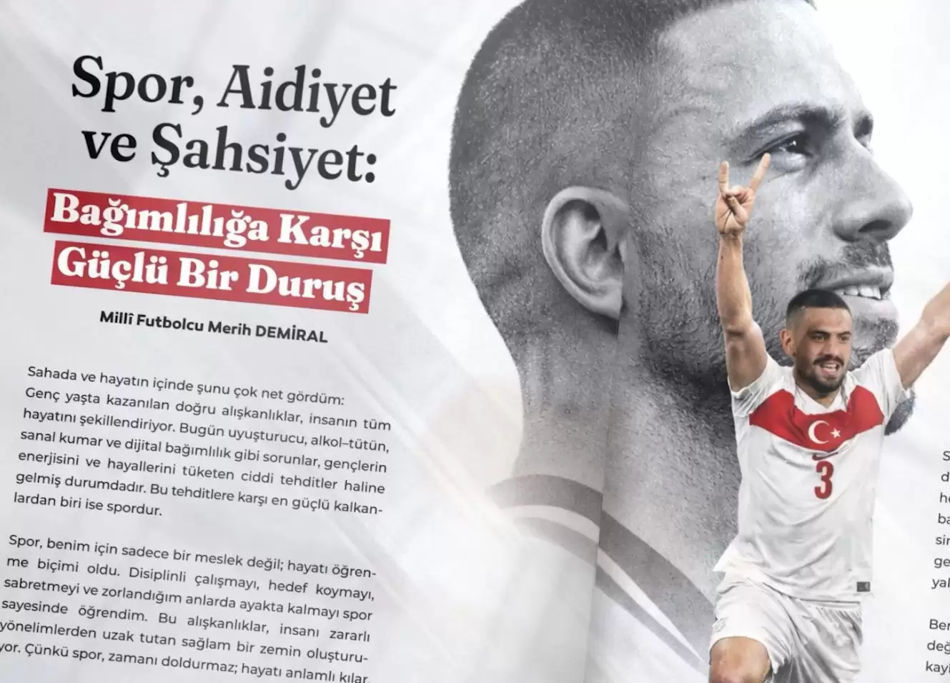 Milli futbolcu Merih Demiral, Ülkü Ocakları Dergisi için “Bağımlılıkla Mücadele” başlıklı bir yazı kaleme aldı. Demiral yazısında, özellikle gençleri tehdit eden madde ve teknoloji bağımlılığına dikkat çekerken, sporun disiplin, irade ve sağlıklı yaşam alışkanlıkları kazandırmadaki rolünü vurguladı.