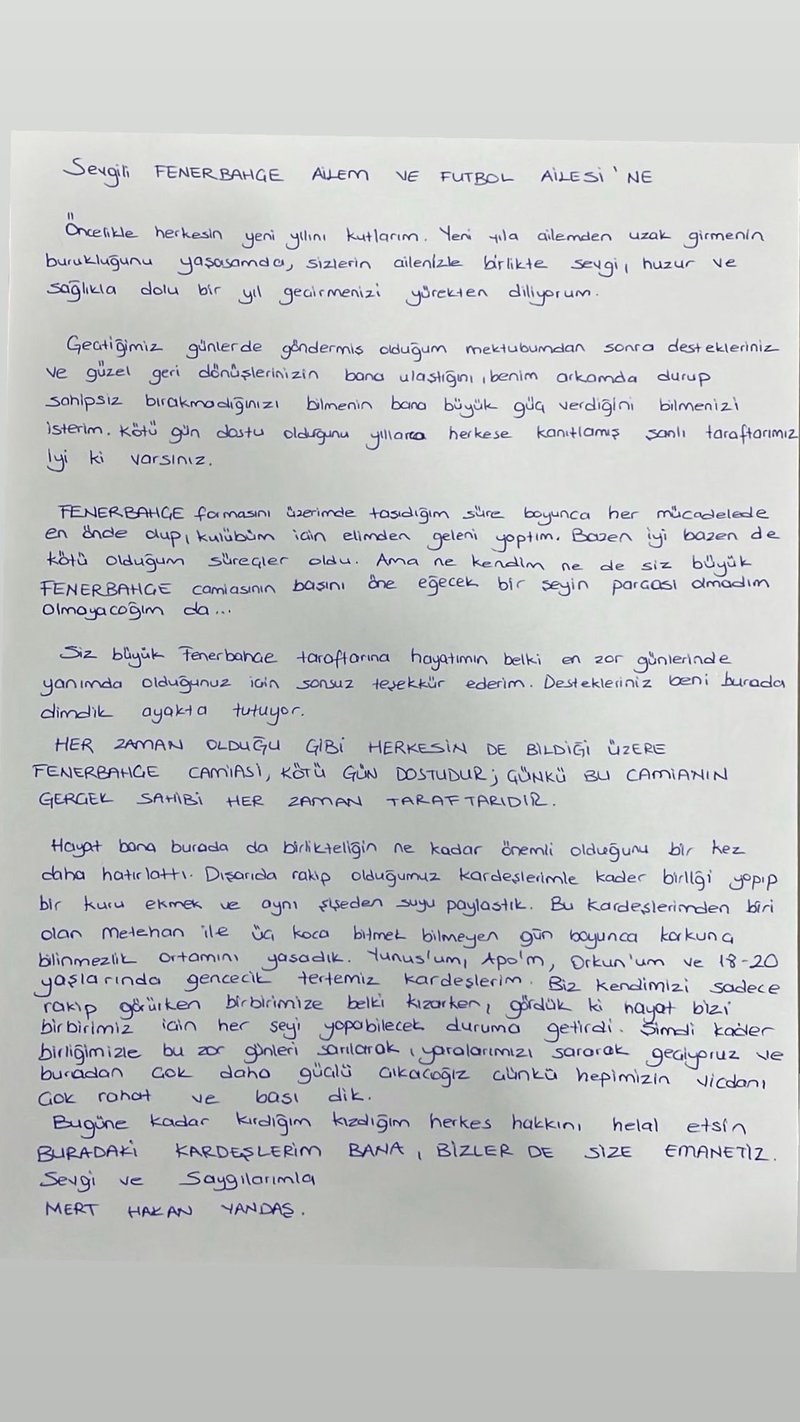 Bashis soruşturması kapsamında tutuklanan ve Silivri Cezaevine gönderilen Fenerbahçe futbolcusu Mert Hakan Yandaş, yeni bir mektup kaleme aldı. İşte Mert Hakan Yandaş’ın sözleri: