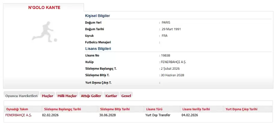 Bazı hikayeler zaman alır, ama yarım kalmaz.Fenerbahçemize hoş geldin N’Golo Kante. pic.twitter.com/Yd8t0lldUd— Fenerbahçe SK (@Fenerbahce) February 4, 2026