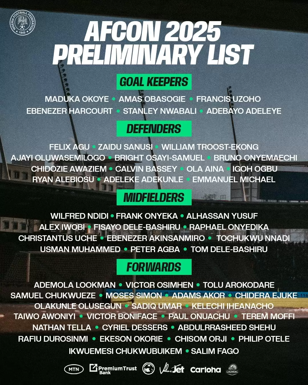 Kadroda Galatasaray’dan Victor Osimhen, Beşiktaş’tan Wilfred Ndidi ve Trabzonspor’dan Paul Onuachu yer aldı.