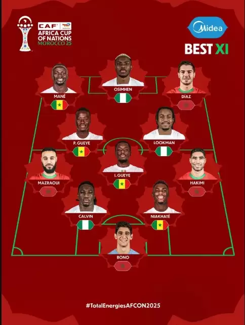 Afrika Futbol Konfederasyonu (CAF), yaptığı açıklamada, 35. Afrika Uluslar Kupası’nın (AFCON 2025) en iyi 11’ini duyurdu. Turnuva şampiyonu Senegal ile finalist Fas, organizasyonun en iyi 11’inde dörder oyuncuyla öne çıktı.