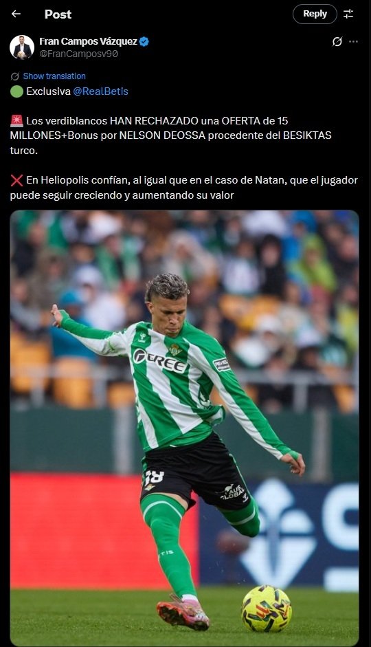Betis, oyuncunun gelişimini sürdürerek değerini artırabileceğine inanması sebebiyle, Beşiktaş’ın yaptığı teklifi reddetti.