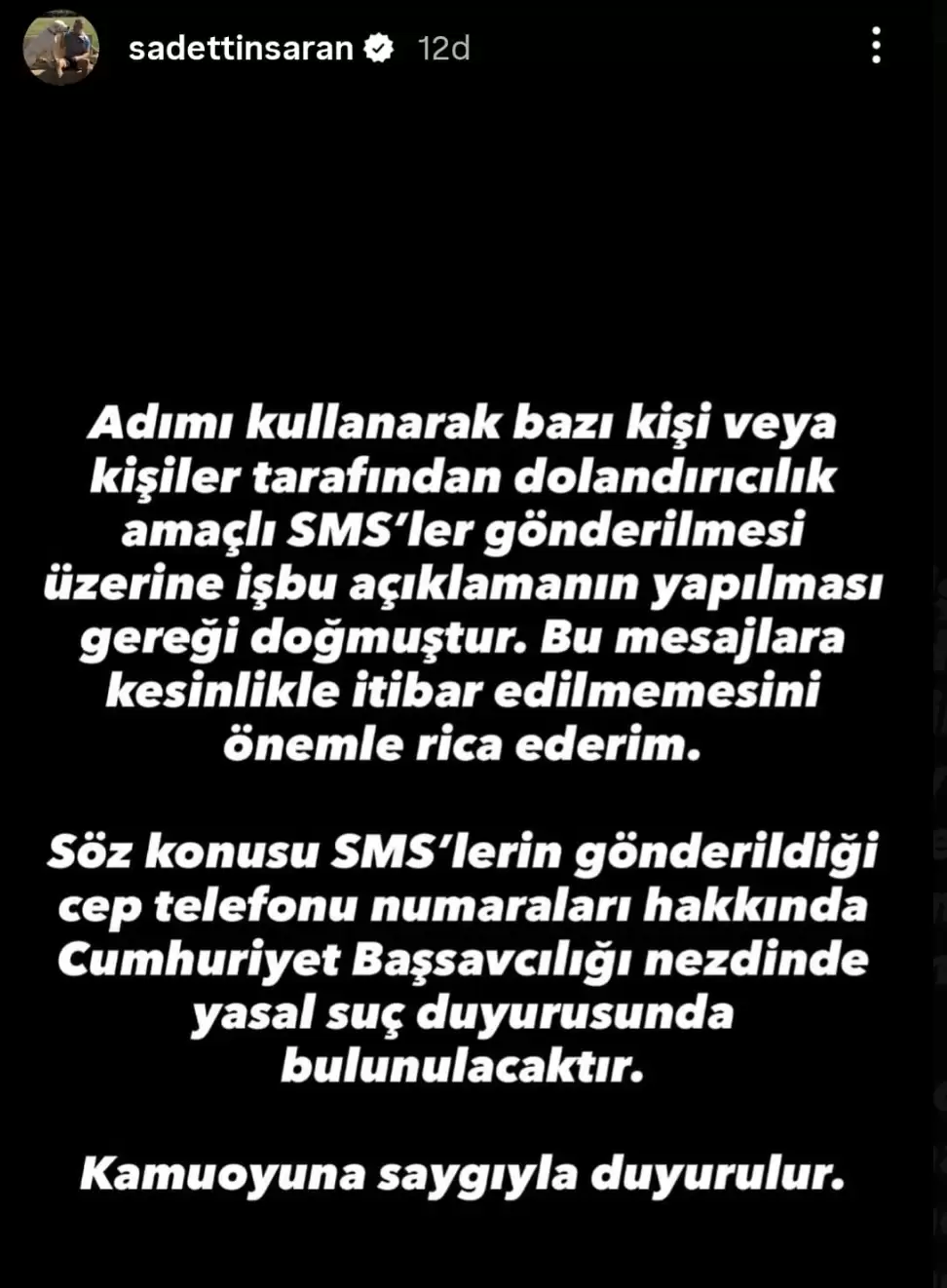 “Adımı kullanarak bazı kişi veya kişiler tarafından dolandırıcılık amaçlı SMS’ler gönderilmesi üzerine işbu açıklamanın yapılması gereği doğmuştur. Bu mesajlara kesinlikle itibar edilmemesini önemle rica ederim.