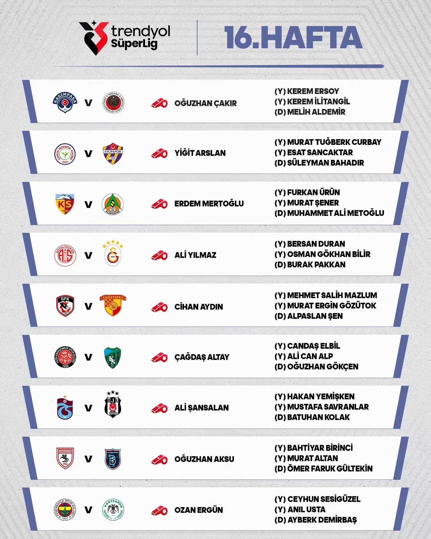 Süper Lig’de 16. haftanın programı ve düdük çalacak hakemler şöyle:
