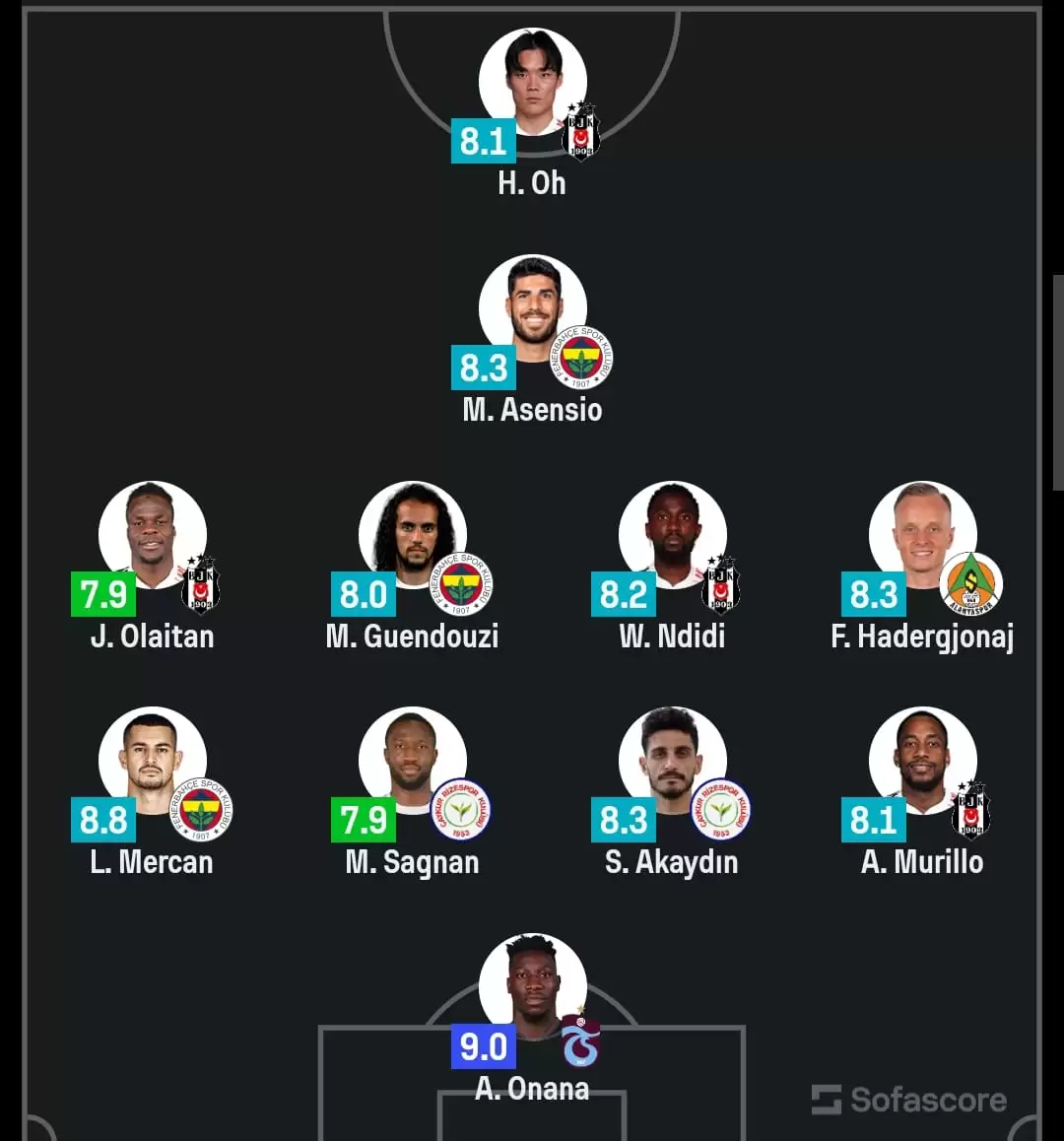 Süper Lig’de haftanın en yüksek puan alan futbolcuları açıklandı. Performans verilerine göre oluşturulan haftanın 11’inde Trabzonspor, Fenerbahçe, Beşiktaş, Rizespor ve Alanyaspor’dan isimler yer aldı. Zirvede ise 9.0 puanla Onana bulunuyor. İşte SofaScore’nin ilk 11’i