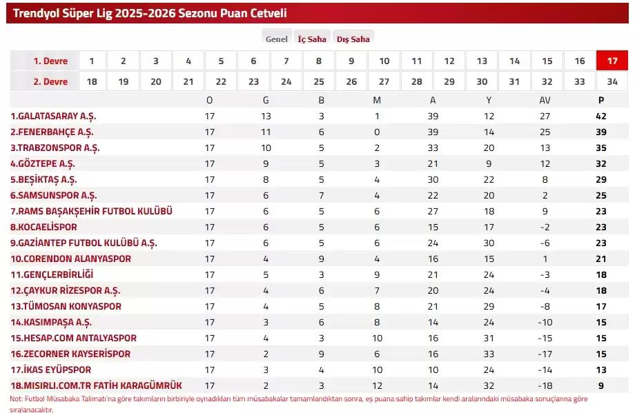 Trendyol Süper Lig’in 17. haftası bugün oynanan 2 maçla tamamlandı. Galatasaray ligin ilk yarısını lider bitirdi.
