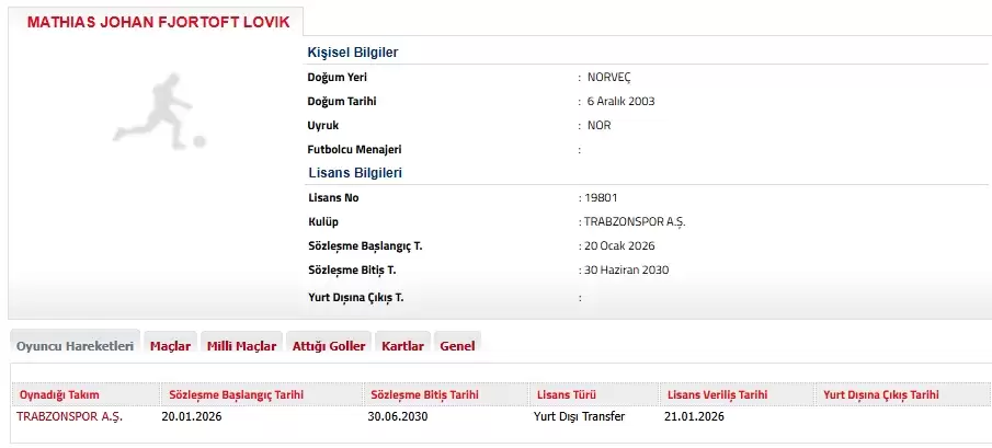 Trabzonspor, Norveçli sol bek oyuncusu Mathias Johan Fjortoft Lovik’i 4,5 yıllığına renklerine bağladığını duyurdu.