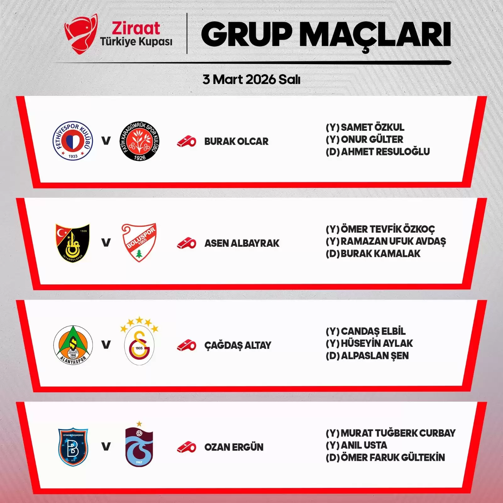 Türkiye Kupası’nda yarın oynanacak maçları yönetecek hakemler şöyle: